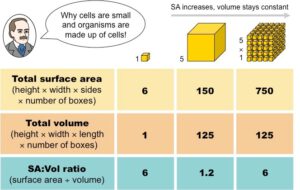 Bron. https://ib.bioninja.com.au/standard-level/topic-1-cell-biology/11-introduction-to-cells/sa–vol-ratio.html